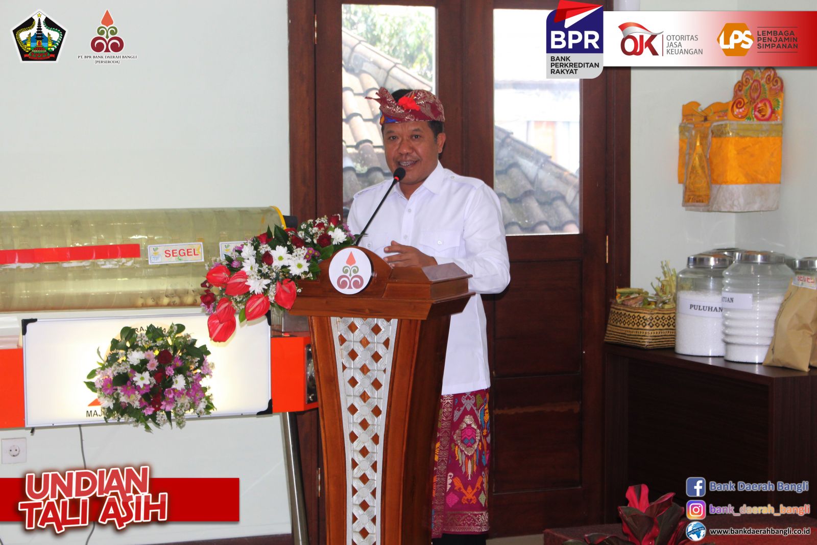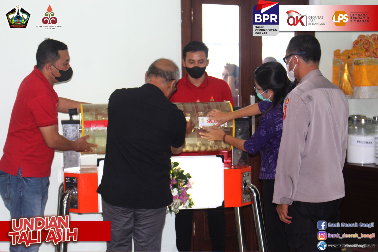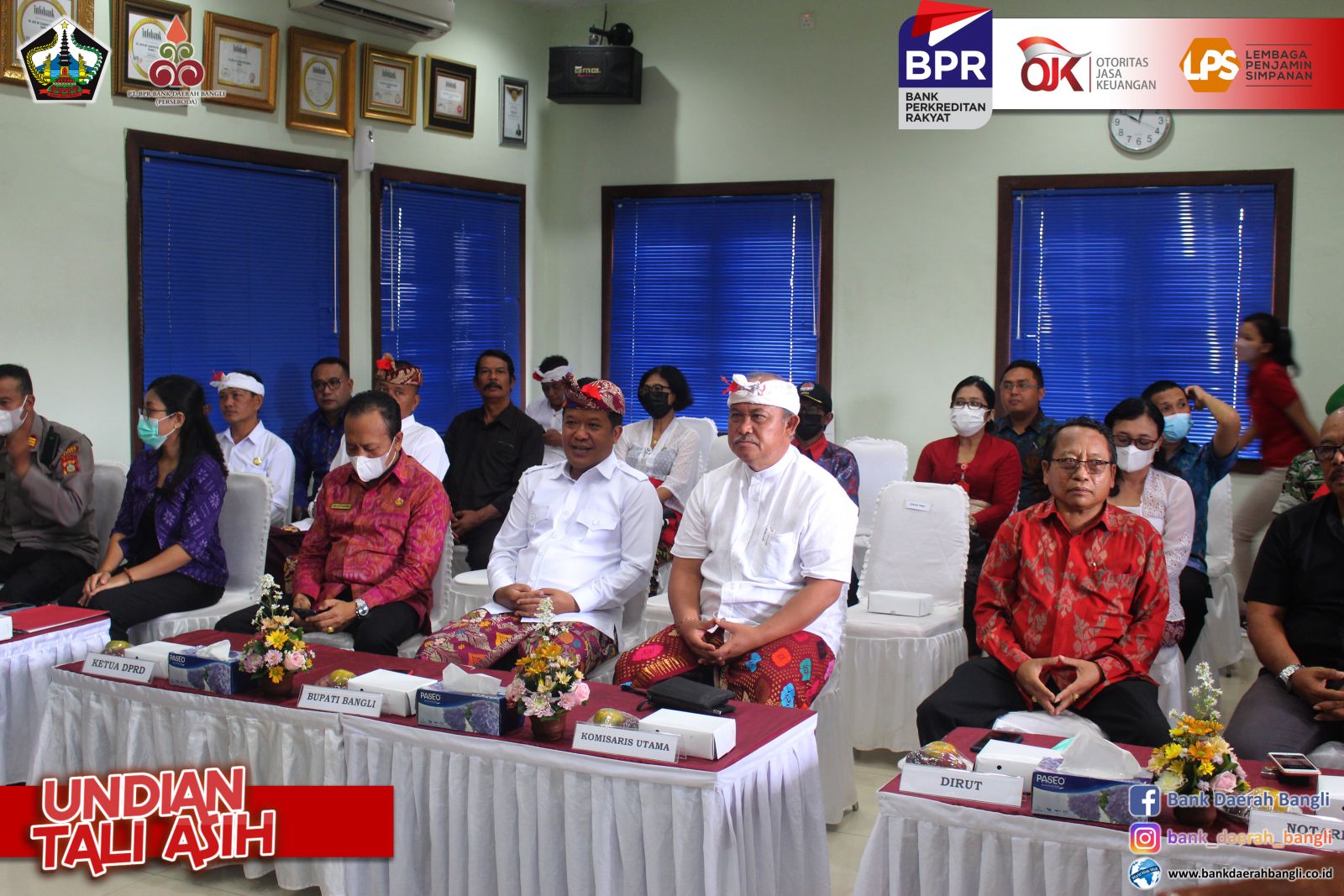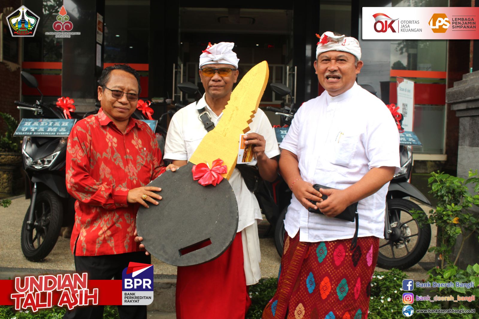 Jumat, 28 Oktober 2022 PT. BPR Bank Daerah Bangli (Perseroda) melaksanakan Undian Tali Asih untuk nasabah yang mempunyai simpanan di Bank Daerah Bangli baik tabungan maupun deposito . Bupati Bangli Sang Nyoman Sedana Arta, S.E. menghadiri, sekaligus mensosialisasikan Tabungan Simpel dalam mendukung peningkatan tercapainya Inklusi Keuangan, bertempat di Aula PT. BPR Bank Daerah Bangli. Dalam kegiatan undian tersebut juga dihadiri oleh Ketua DPRD Bangli I Ketut Suastika, S.H., Komisaris Utama PT. BPR Bank Daerah Bangli Ida Bagus Gde Giri Putra, Pimpinan OPD Terkait dilingkungan Pemkab Bangli dan Direktur Utama PT. BPR Bank Daerah Bangli. Direktur Utama PT. BPR Bank Daerah Bangli I Made Astawa dalam laporannya menyampaikan, dalam pelaksanaan undian tali asih periode tahun 2021/2022 memberikan Grandprize berupa 1 (satu) unit mobil Daihatsu Xenia X STD dan Hadiah Utama berupa 5 (lima) unit sepeda motor, akan diundi masing-masing 1 (satu) unit untuk nasabah diwilayah kecamatan Bangli, Tembuku, dan Susut. Untuk kecamatan Kintamani diundi 2 (dua) unit sepeda motor untuk nasabah diwilayah Kintamani Barat dan Kintamani Timur. Ditambahkannya, Pemberian Nomor Undian berdasarkan pengendapan saldo rata-rata selama 12 bulan, dari 31 Oktober 2021 sampai dengan 30 September 2022. Kegiatan Tali Asih ini bertujuan Meningkatkan minat masyarakat untuk menyimpan dananya di PT. BPR Bank Daerah Bangli (Perseroda), sebagai satu-satunya Bank yang 100 % sahamnya milik masyarakat Bangli, dengan demikian berperan juga menaikkan tingkat inklusi keuangan masyarakat Bangli khususnya dan meningkatkan kepercayaan dan loyalitas nasabah. Dalam sesi penyerahan hadiah pemenang undian masing-masing 5 sepeda motor dan 1 mobil dilakukan simbolis oleh pemenang atau perwakilannya dari Koordinator Kantor Kas Bank Daerah Bangli.