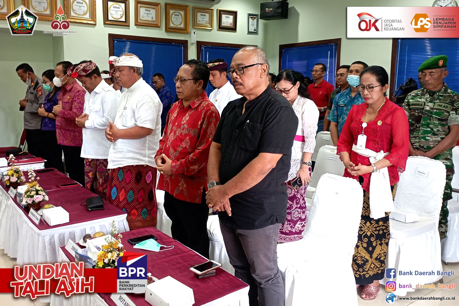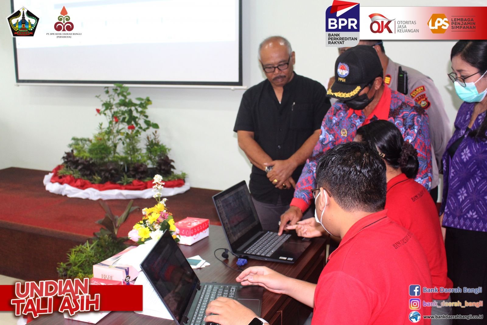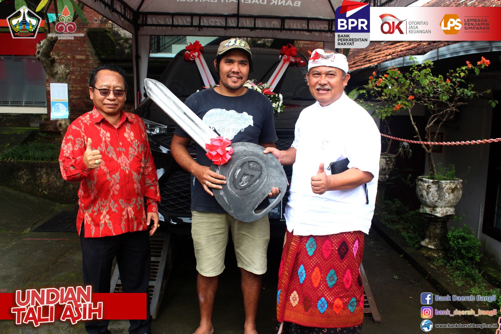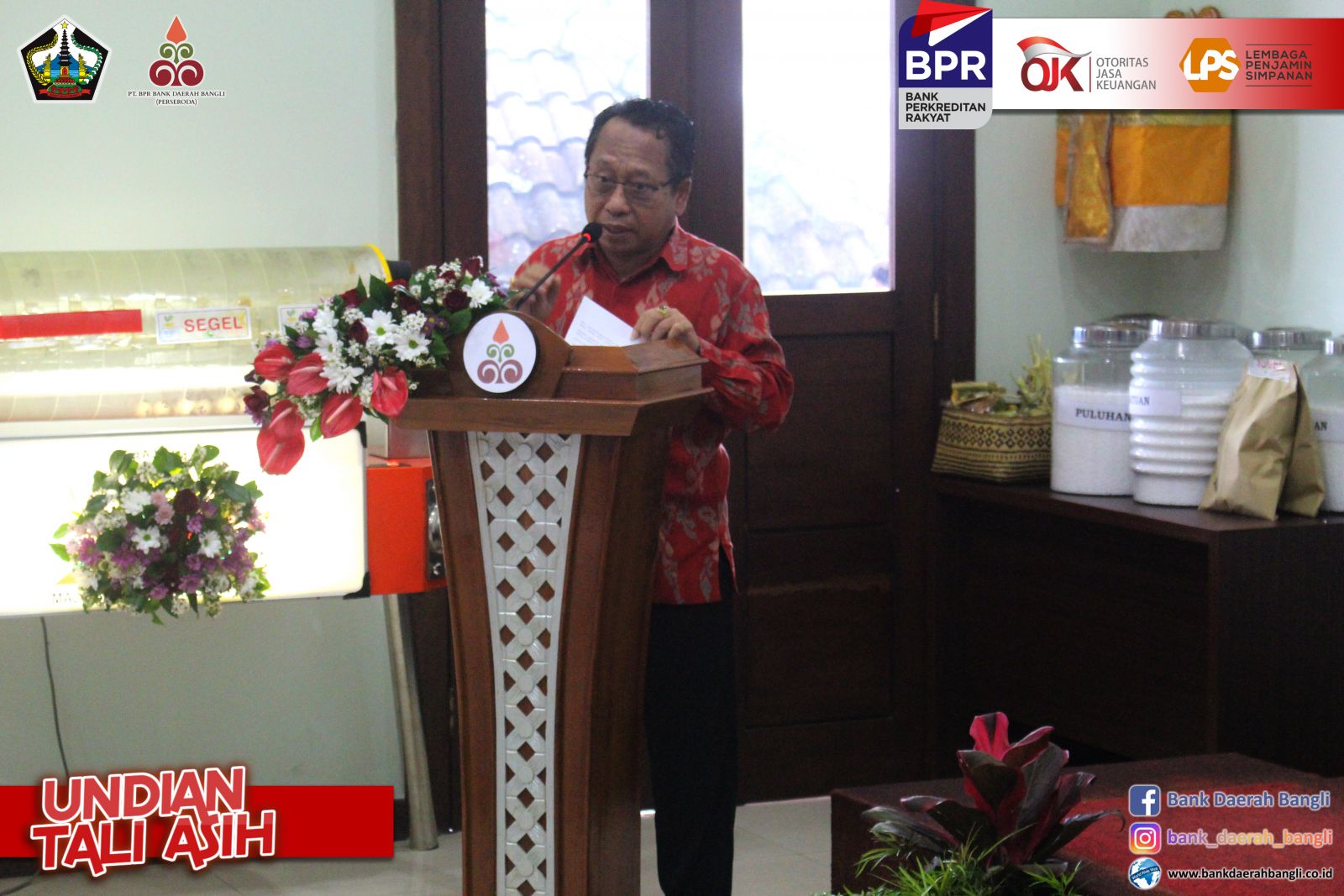 Jumat, 28 Oktober 2022 PT. BPR Bank Daerah Bangli (Perseroda) melaksanakan Undian Tali Asih untuk nasabah yang mempunyai simpanan di Bank Daerah Bangli baik tabungan maupun deposito . Bupati Bangli Sang Nyoman Sedana Arta, S.E. menghadiri, sekaligus mensosialisasikan Tabungan Simpel dalam mendukung peningkatan tercapainya Inklusi Keuangan, bertempat di Aula PT. BPR Bank Daerah Bangli. Dalam kegiatan undian tersebut juga dihadiri oleh Ketua DPRD Bangli I Ketut Suastika, S.H., Komisaris Utama PT. BPR Bank Daerah Bangli Ida Bagus Gde Giri Putra, Pimpinan OPD Terkait dilingkungan Pemkab Bangli dan Direktur Utama PT. BPR Bank Daerah Bangli. Direktur Utama PT. BPR Bank Daerah Bangli I Made Astawa dalam laporannya menyampaikan, dalam pelaksanaan undian tali asih periode tahun 2021/2022 memberikan Grandprize berupa 1 (satu) unit mobil Daihatsu Xenia X STD dan Hadiah Utama berupa 5 (lima) unit sepeda motor, akan diundi masing-masing 1 (satu) unit untuk nasabah diwilayah kecamatan Bangli, Tembuku, dan Susut. Untuk kecamatan Kintamani diundi 2 (dua) unit sepeda motor untuk nasabah diwilayah Kintamani Barat dan Kintamani Timur. Ditambahkannya, Pemberian Nomor Undian berdasarkan pengendapan saldo rata-rata selama 12 bulan, dari 31 Oktober 2021 sampai dengan 30 September 2022. Kegiatan Tali Asih ini bertujuan Meningkatkan minat masyarakat untuk menyimpan dananya di PT. BPR Bank Daerah Bangli (Perseroda), sebagai satu-satunya Bank yang 100 % sahamnya milik masyarakat Bangli, dengan demikian berperan juga menaikkan tingkat inklusi keuangan masyarakat Bangli khususnya dan meningkatkan kepercayaan dan loyalitas nasabah. Dalam sesi penyerahan hadiah pemenang undian masing-masing 5 sepeda motor dan 1 mobil dilakukan simbolis oleh pemenang atau perwakilannya dari Koordinator Kantor Kas Bank Daerah Bangli.